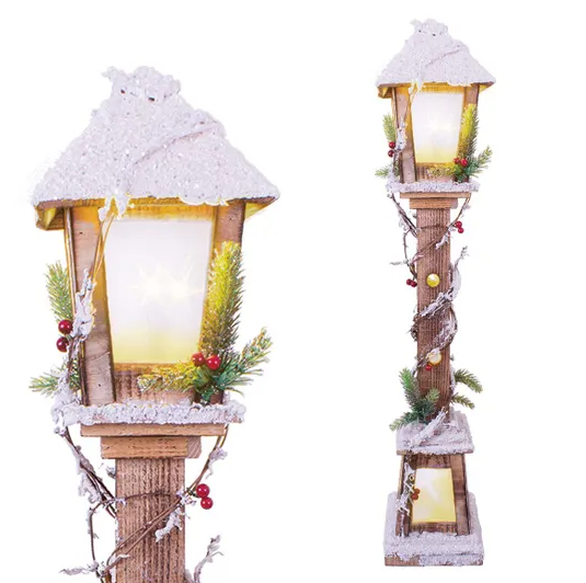 Snow-Topped Lamppost – Add festive charm with this 85cm wooden snow-covered lamppost, featuring frosted windows and 10 warm white LEDs that create a cosy glow. Battery powered (2 x AA, not included) with a 6-hour timer, it’s perfect for mantels, windowsills, or tabletops.