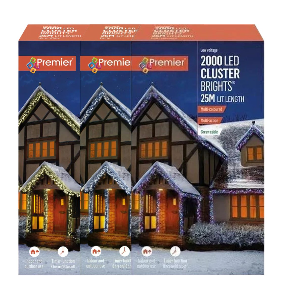 Bring your Christmas display to life with the Premier 2000 Multi Colour LED Cluster Lights. Featuring vibrant, energy-efficient LEDs on a dense 25 m string, these multi-action lights create a dazzling festive glow indoors or outdoors, perfect for trees, garlands, or statement displays.